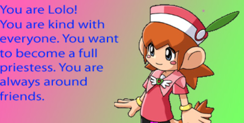 You are Lolo! You are kind with everyone. You want to become a full priestess. You are always around friends.