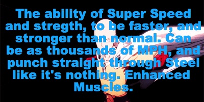 The ability of super speed and strength, to be faster, and stronger than normal. Can be as thousands of MPH, and punch straight through Steel like it's nothing. Enhanced muscles.